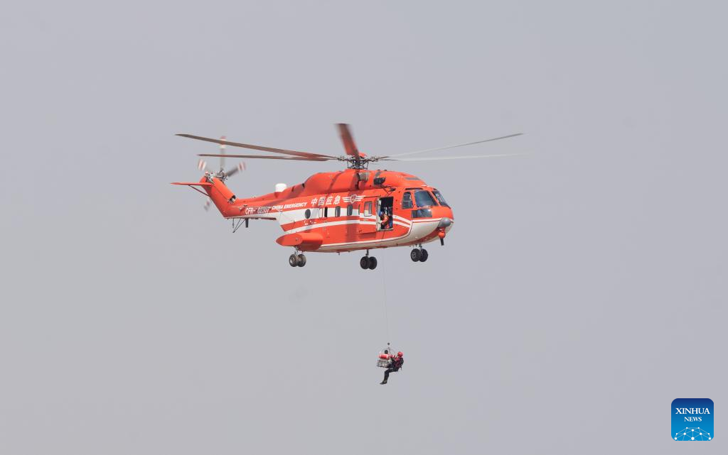 Around 8,000 emergency response personnel, four helicopters, one drone and various departments associated with maritime, railway, aviation and road operations took part in the exercise. (Xinhua/Han Chuanhao)