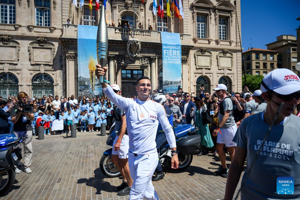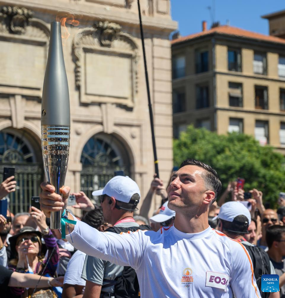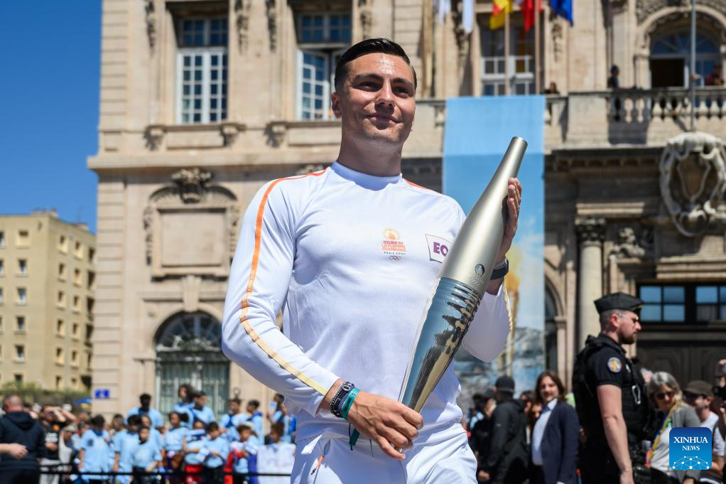 Local firefighter and torch bearer Matthieu Gudet holds the Olympic Torch during the relay of the Olympic flame of Paris 2024 in Marseille, France, May 9, 2024. (Photo by Julien Mattia/Xinhua)