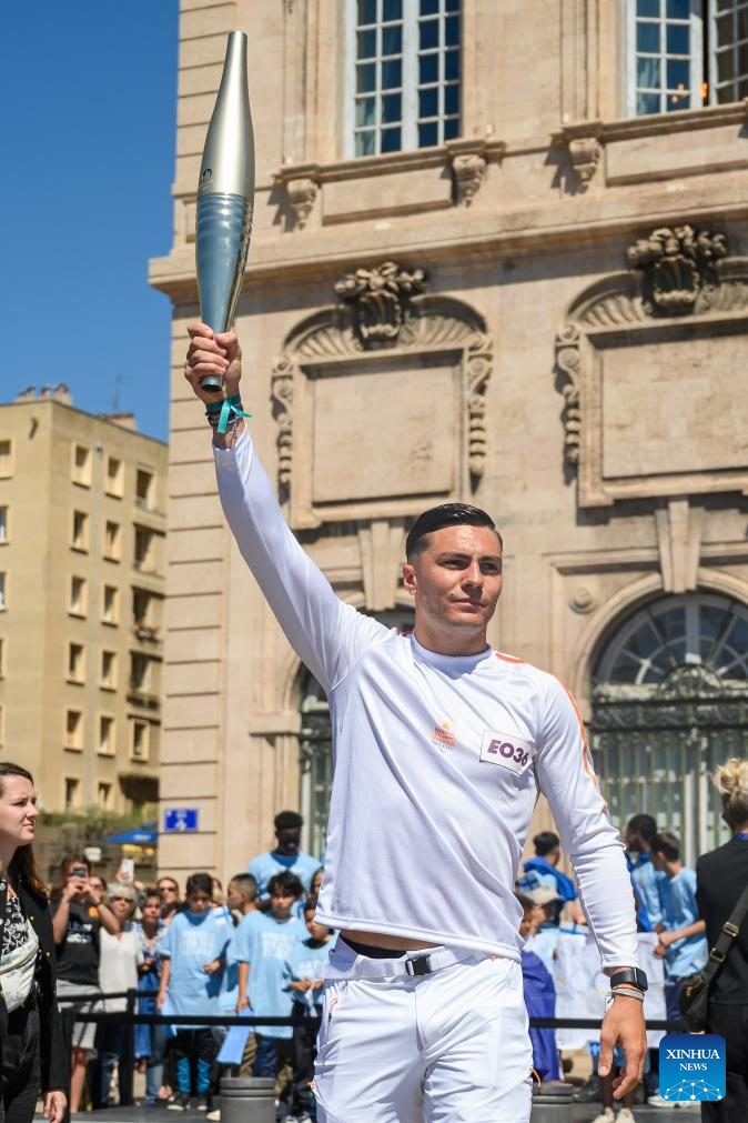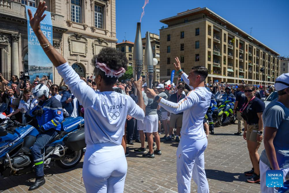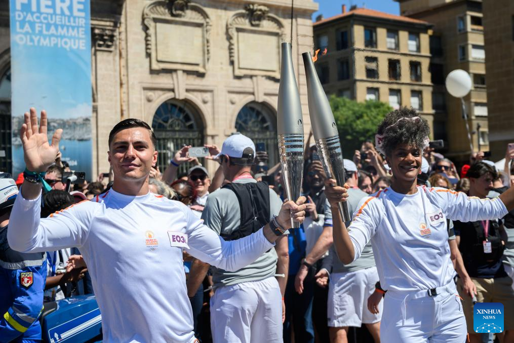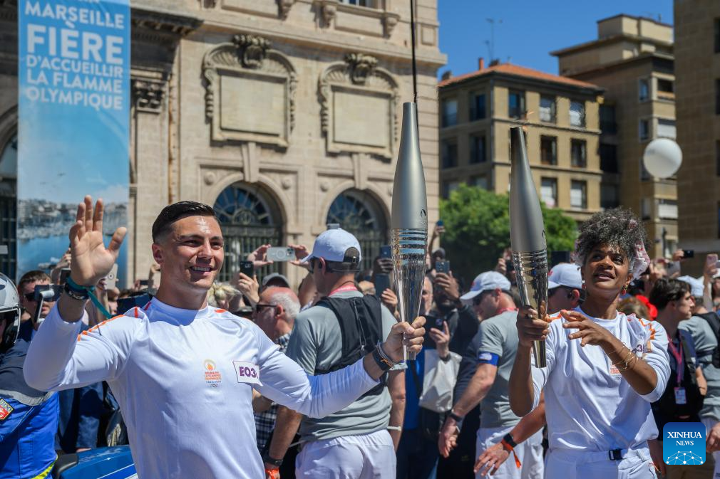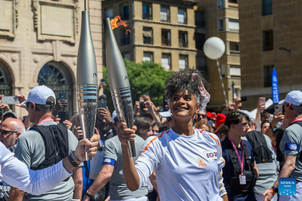 Tourch bearer Maryam Kaba passes the Olympic Torch during the relay of the Olympic flame of Paris 2024 in Marseille, France, May 9, 2024. (Photo by Julien Mattia/Xinhua)