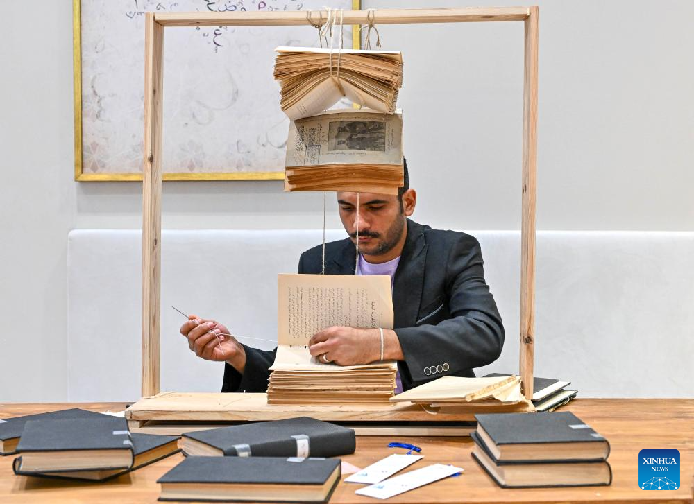 A man demonstrates techniques of book binding in a classical style during the 33rd Doha International Book Fair in Doha, Qatar, May 11, 2024. The 33rd Doha International Book Fair kicked off here in the Qatari capital on Thursday with Chinese publishers displaying about 300 types of books about China. (Photo by Nikku/Xinhua)