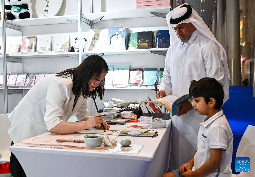 People visit the booth of a Chinese exhibitor during the 33rd Doha International Book Fair in Doha, Qatar, May 11, 2024. The 33rd Doha International Book Fair kicked off here in the Qatari capital on Thursday with Chinese publishers displaying about 300 types of books about China. (Photo by Nikku/Xinhua)