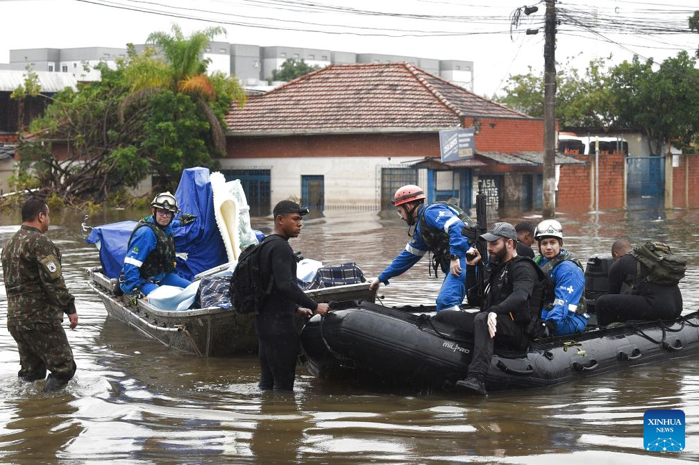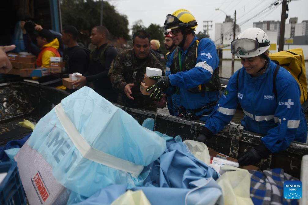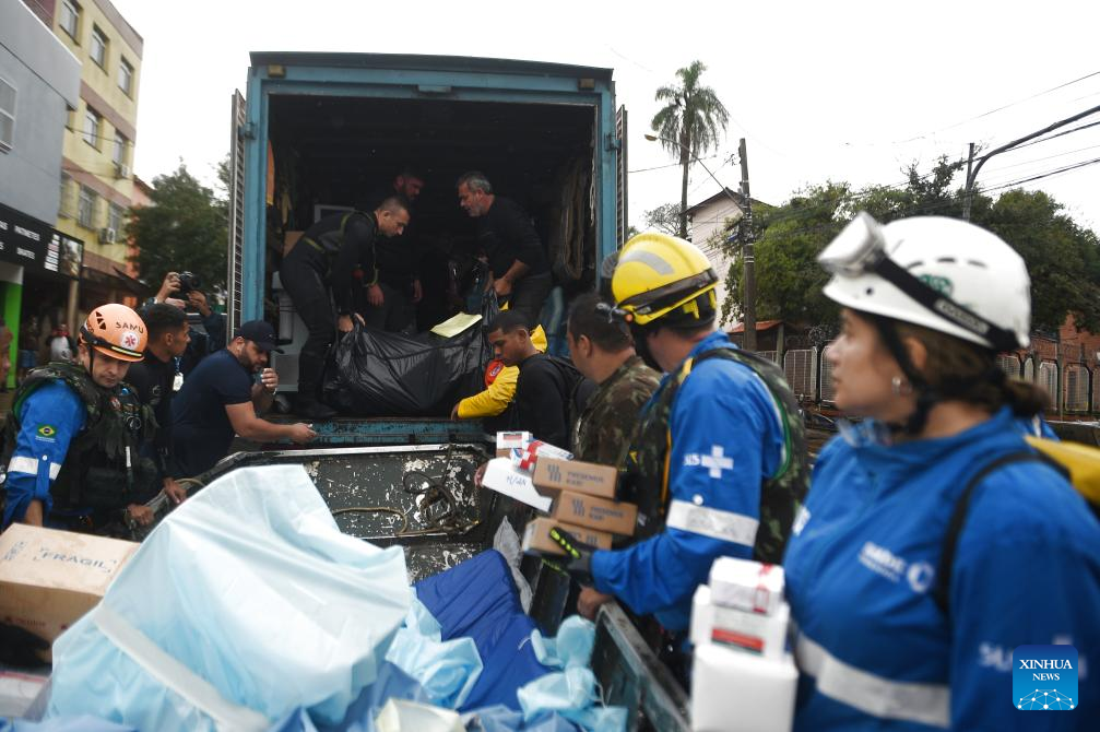Rescue team members transfer equipment and medicine from a flooded hospital in Canoas, Rio Grande do Sul state, Brazil, May 10, 2024. The death toll from the storms and floods in south Brazil's Rio Grande do Sul state has climbed to 136, with 125 people still missing and 756 more injured, the state's civil defense agency said Saturday. (Photo by Lucio Tavora/Xinhua)