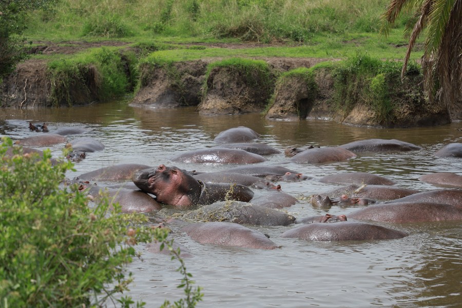 Hippos are seen at Serengeti National Park in Tanzania, Feb. 10, 2022. (Photo by Cao Jingmin/Xinhua)