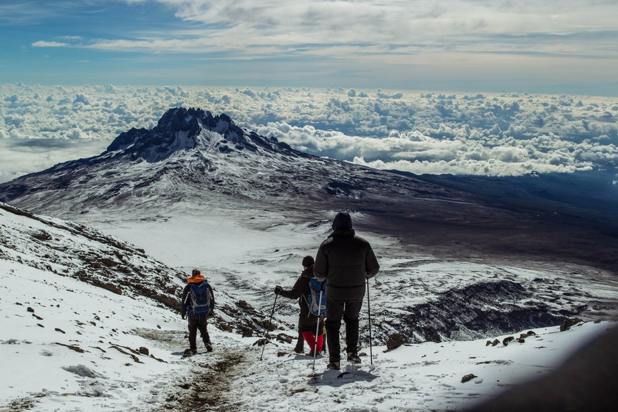 Hikers descend from Uhuru Peak, the highest point of Africa, on Mount Kilimanjaro, northern Tanzania, Nov. 19, 2013. (Xinhua/Li Jing)