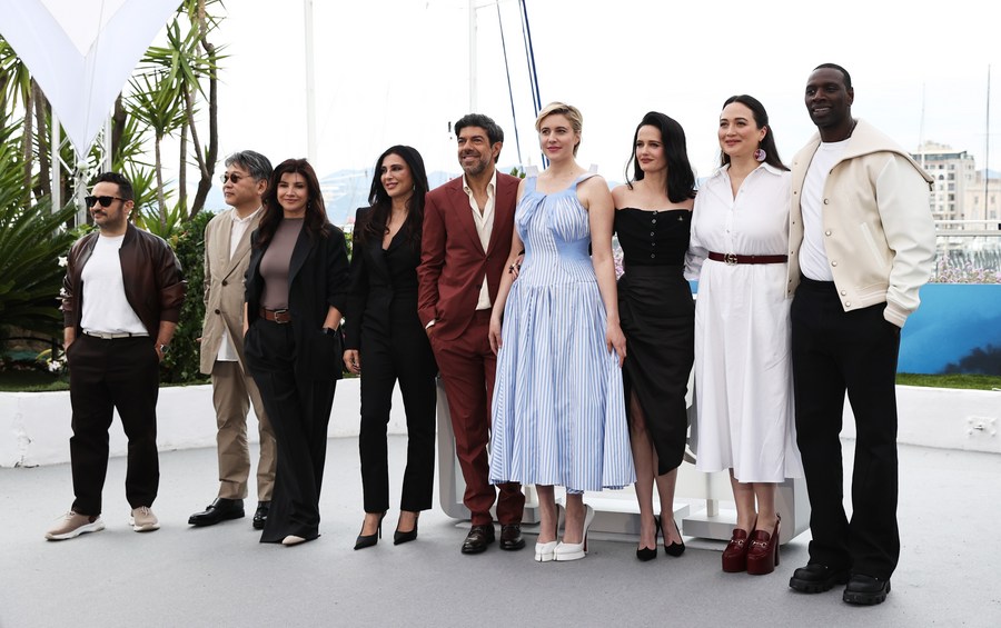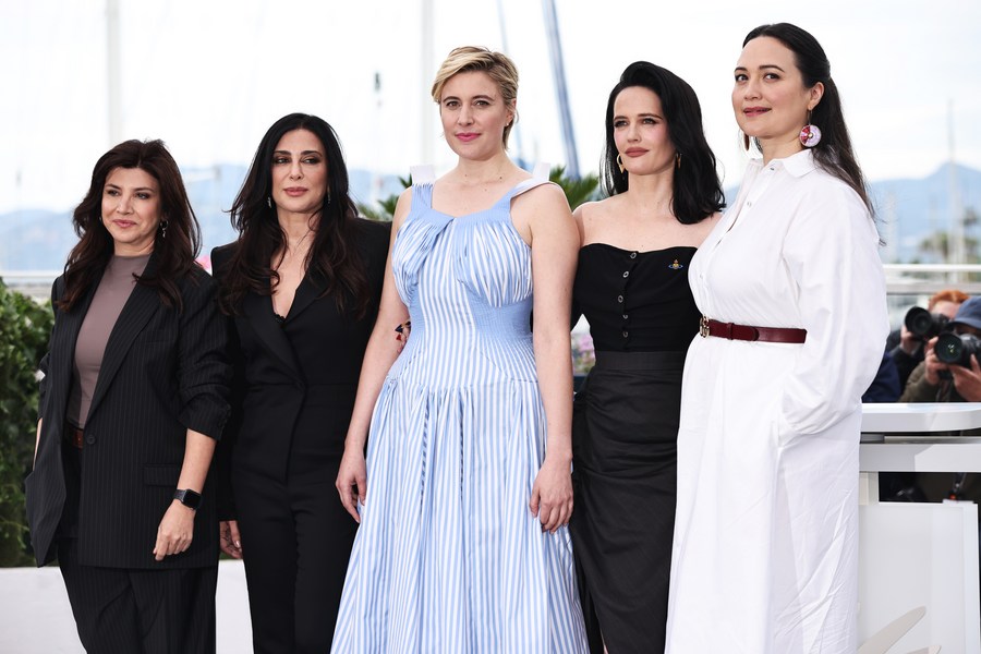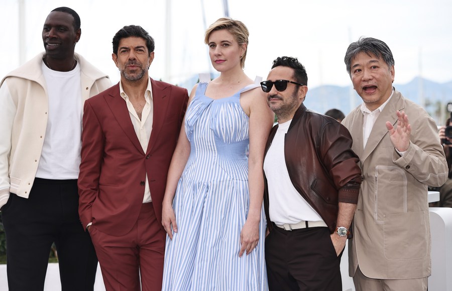 Greta Gerwig (C), jury president of the 77th Cannes Film Festival, and other members of the jury pose at a photocall before the opening ceremony of the 77th Cannes Film Festival in Cannes, southern France, May 14, 2024. (Xinhua/Gao Jing)