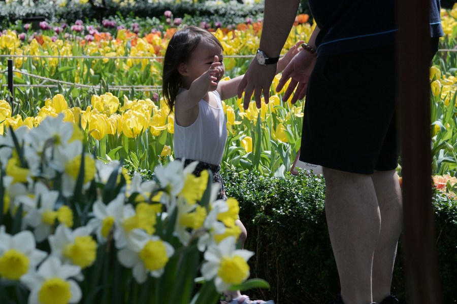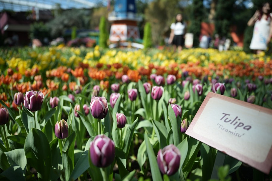 Tourists view the tulip blossoms at the floral exhibition "Tulipmania" at Singapore's Gardens by the Bay on May 14, 2024. (Photo by Then Chih Wey/Xinhua)■