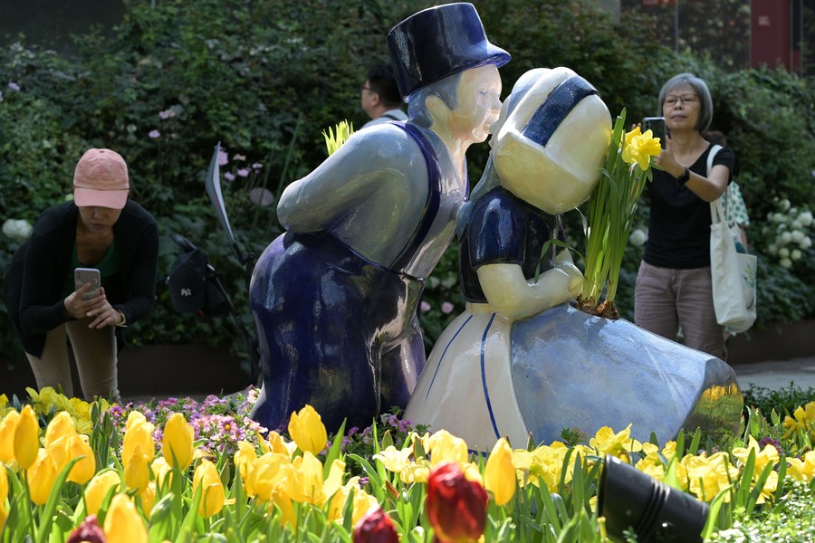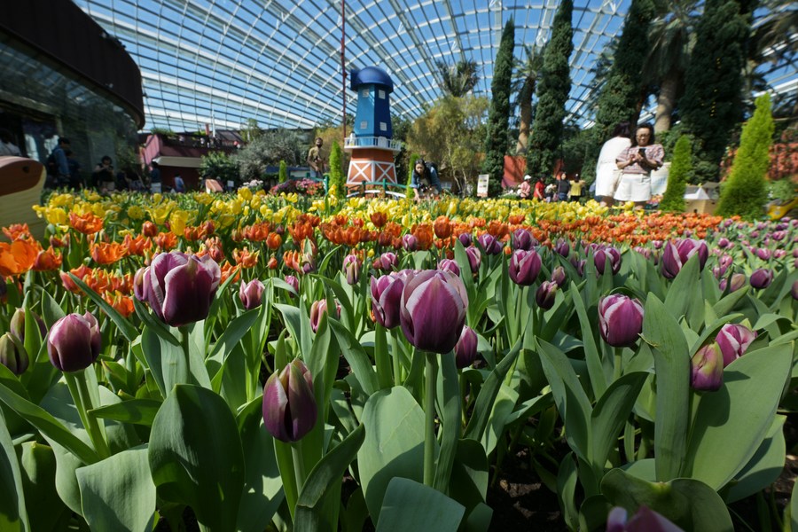 Tourists visit the floral exhibition "Tulipmania" at Singapore's Gardens by the Bay on May 14, 2024. (Photo by Then Chih Wey/Xinhua)