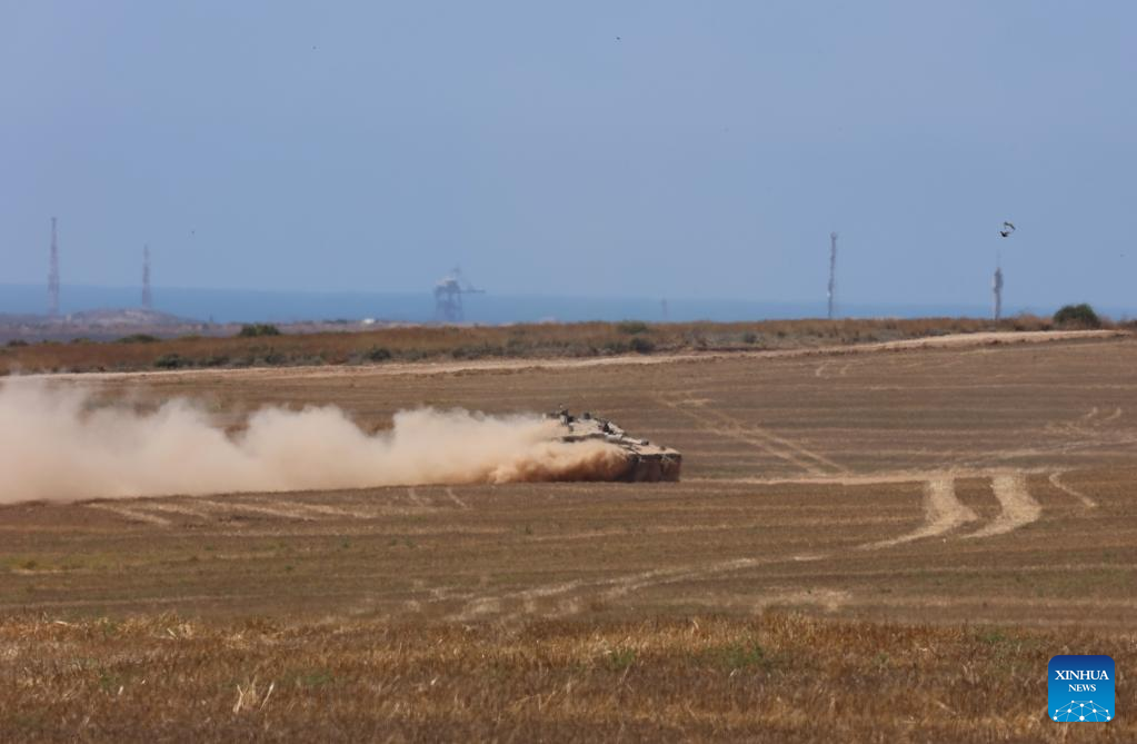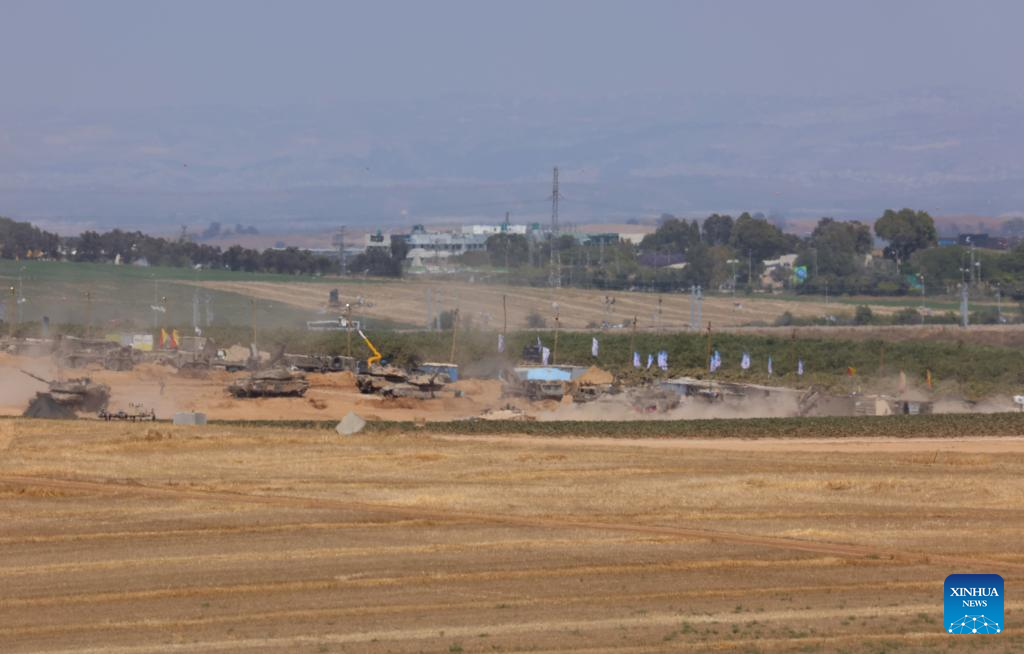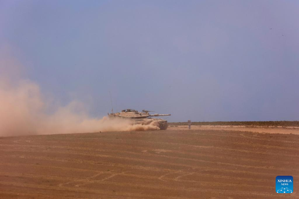An Israeli tank moves along the border with northern Gaza Strip, in southern Israel, on May 16, 2024. Five Israeli soldiers were killed and seven others injured, three of them seriously, by errant Israeli tank fire in the Jabalia refugee camp in the northern Gaza Strip, the Israel Defense Forces (IDF) said in a statement on Thursday. (Photo by Gil Cohen Magen/Xinhua)