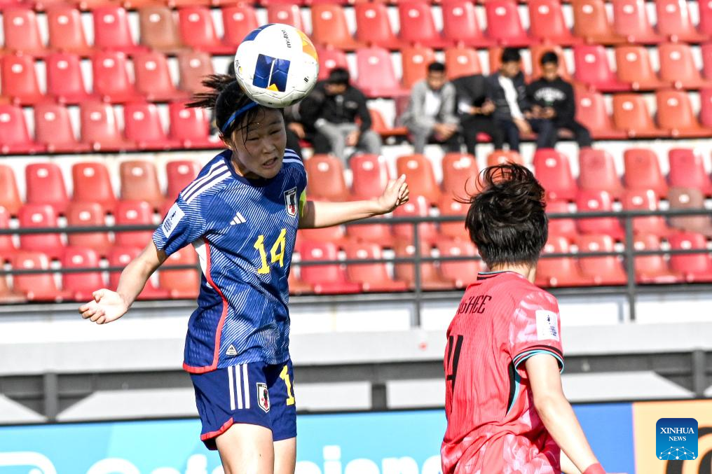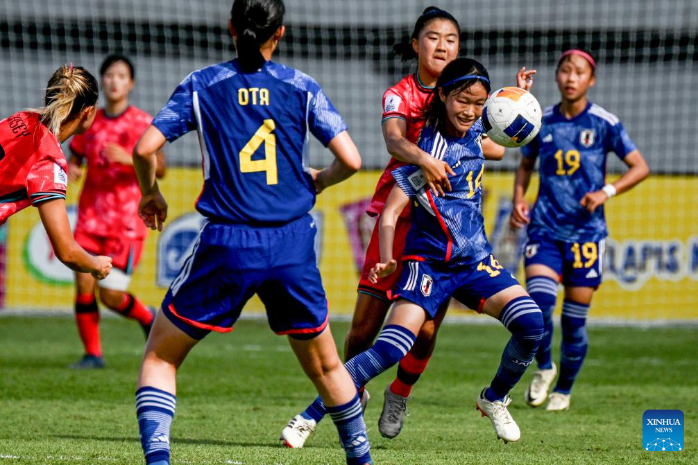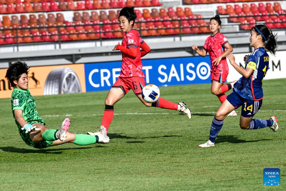 Shinjo Miharu (1st R) of Japan shoots during the semifinal of AFC U-17 Women's Asian Cup between Japan and South Korea in Bali, Indonesia, May 16, 2024. (Xinhua/Agung Kuncahya B.)