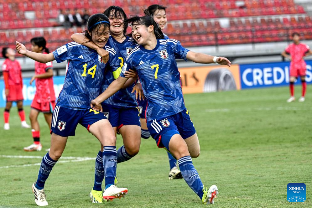 Shinjo Miharu (1st L) of Japan celebrates scoring with teammates during the semifinal of AFC U-17 Women's Asian Cup between Japan and South Korea in Bali, Indonesia, May 16, 2024. (Xinhua/Agung Kuncahya B.)