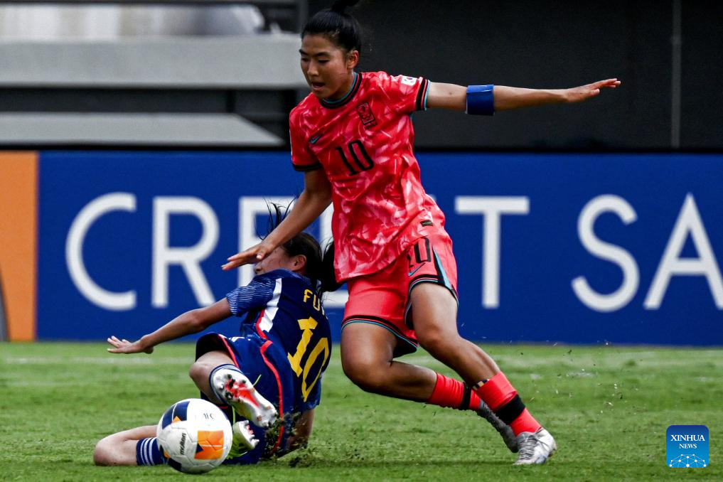 Won Ju-Eun (R) of South Korea vies with Furuta Asako of Japan during the semifinal of AFC U-17 Women's Asian Cup between Japan and South Korea in Bali, Indonesia, May 16, 2024. (Xinhua/Agung Kuncahya B.)