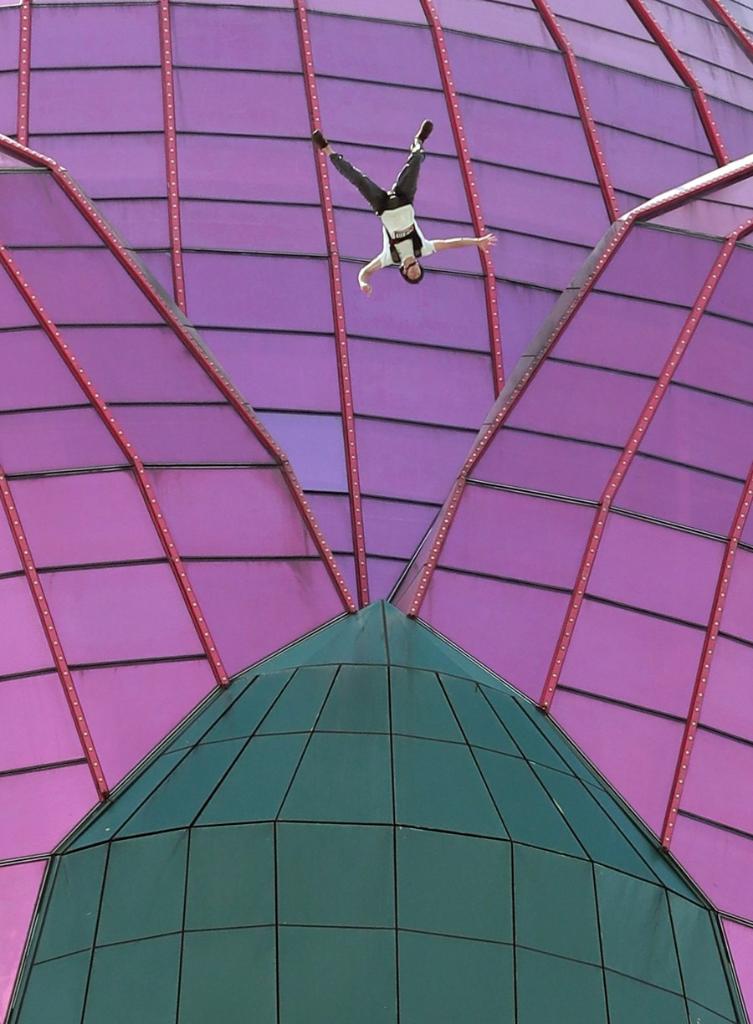 A base jumper leaps off the Colombo Lotus Tower in Colombo, Sri Lanka, on May 14, 2024. (Photo by Ajith Perera/Xinhua)