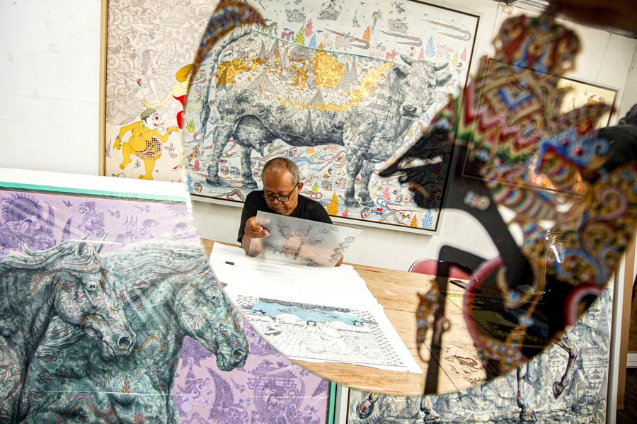 JAKARTA, May 16 (Xinhua) -- Dive into the richness of Javanese culture through the vibrant glass paintings of Subandi Giyanto from Yogyakarta, Indonesia! Explore the world of Javanese puppet characters brought to life through his exquisite art.