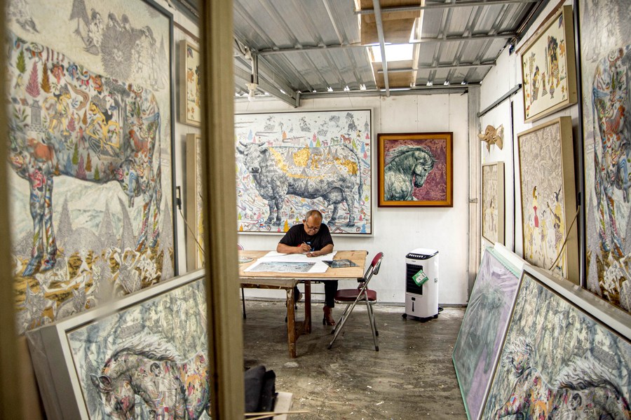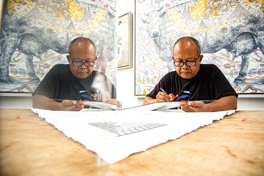 Subandi Giyanto paints on glass at his workshop in Bantul regency, Yogyakarta, Indonesia, on May 15, 2024. (Photo by Agung Supriyanto/Xinhua) ■