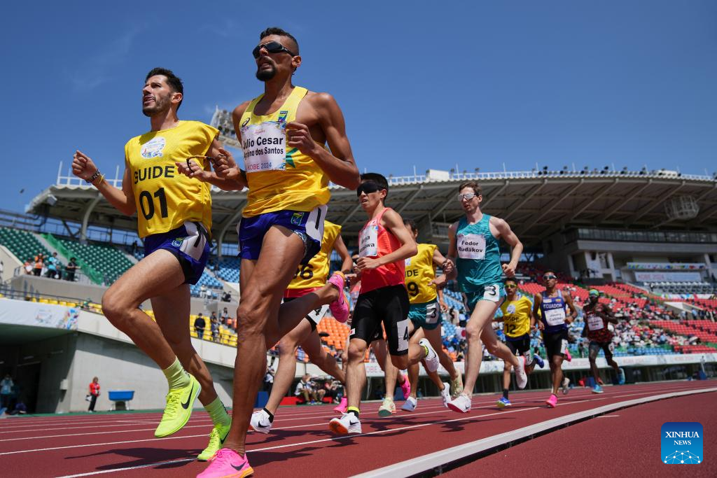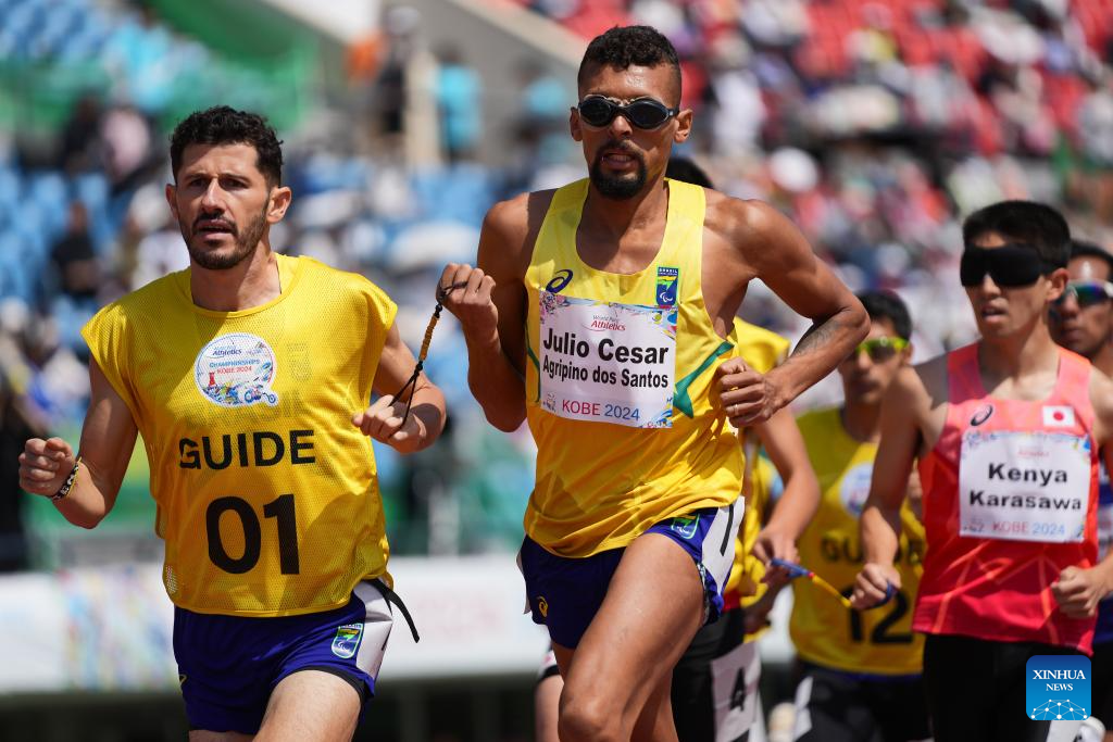 Julio Cesar Agripino dos Santos (R, front) of Brazil competes with his guide Micael Batista dos Santos during Men's 5000m T11 final at the Para Athletics World Championships held in Kobe, Japan, on May 17, 2024. (Xinhua/Zhang Xiaoyu)