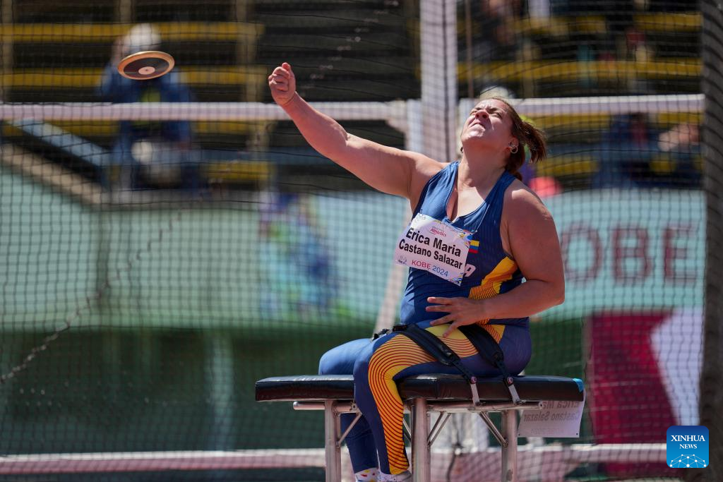 Erica Maria Castano Salazar of Colombia competes during Women's Discus Throw F55 Final at the Para Athletics World Championships held in Kobe, Japan, on May 17, 2024. (Xinhua/Zhang Xiaoyu)