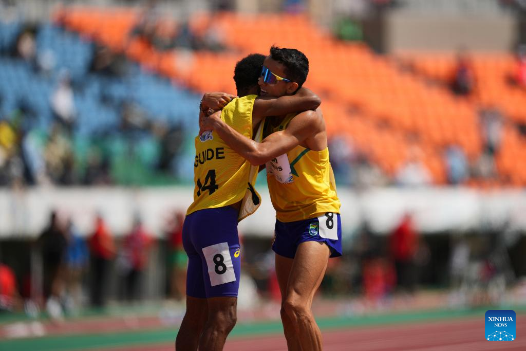 Yeltsin Jacques of Brazil (R) celebrates with his guide Antonio Henrique Barreto Lima after Men's 5000m T11 final at the Para Athletics World Championships held in Kobe, Japan, on May 17, 2024. (Xinhua/Zhang Xiaoyu)