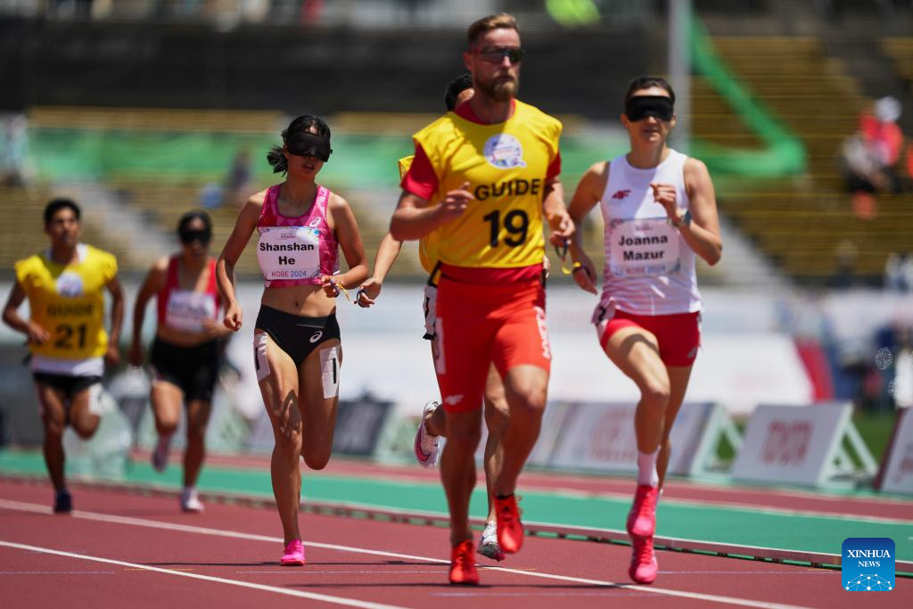 He Shanshan (3rd R) of China and her guide You Junjie compete during Women's 1500m T11 Round 1 at the Para Athletics World Championships held in Kobe, Japan, on May 17, 2024. (Xinhua/Zhang Xiaoyu)