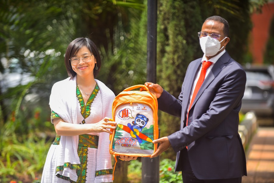 Ethiopian Minister of Education Getahun Mekuria (R) and Country Director of China Foundation for Poverty Alleviation (CFPA) Ethiopia Office Huang Xiaocen pose for photos at the donation ceremony of 20,000 school bags donated by CFPA in Addis Ababa, capital of Ethiopia, Sept. 29, 2021. (Photo by Michael Tewelde/Xinhua)