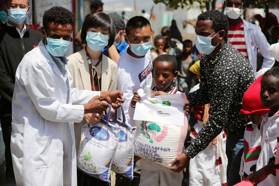 Huang Xiaocen (2nd L, front), deputy director of Chinese Foundation for Poverty Alleviation (CFPA) Ethiopia, distributes food to local students at the Obaay Primary School in Dukem town of Ethiopia's Oromia regional state, on June 9, 2021. (Xinhua/Wang Ping)