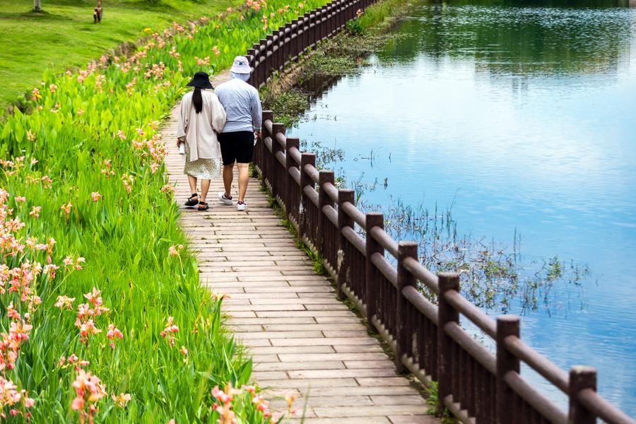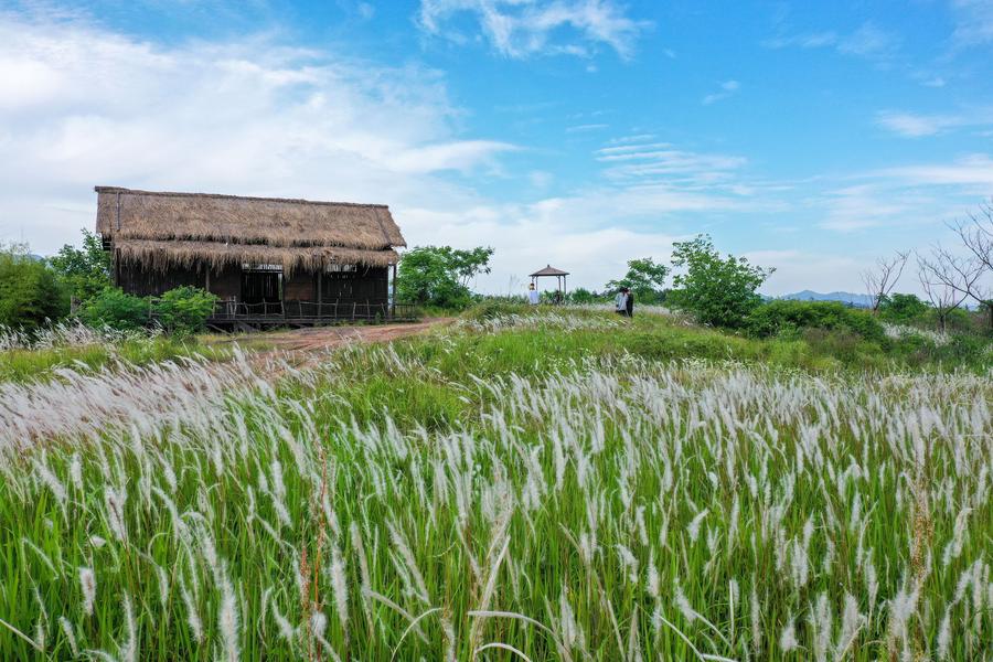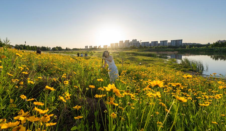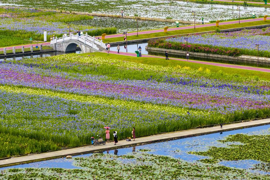 This photo taken on May 16, 2024 shows blooming flowers at the Baita Lake national wetland park in Zhuji City, east China's Zhejiang Province. In recent years, Baita Lake national wetland park has implemented ecological restoration projects to improve the wetland ecological environment and promote the harmonious co-existence between man and nature. (Xinhua/Xu Yu)