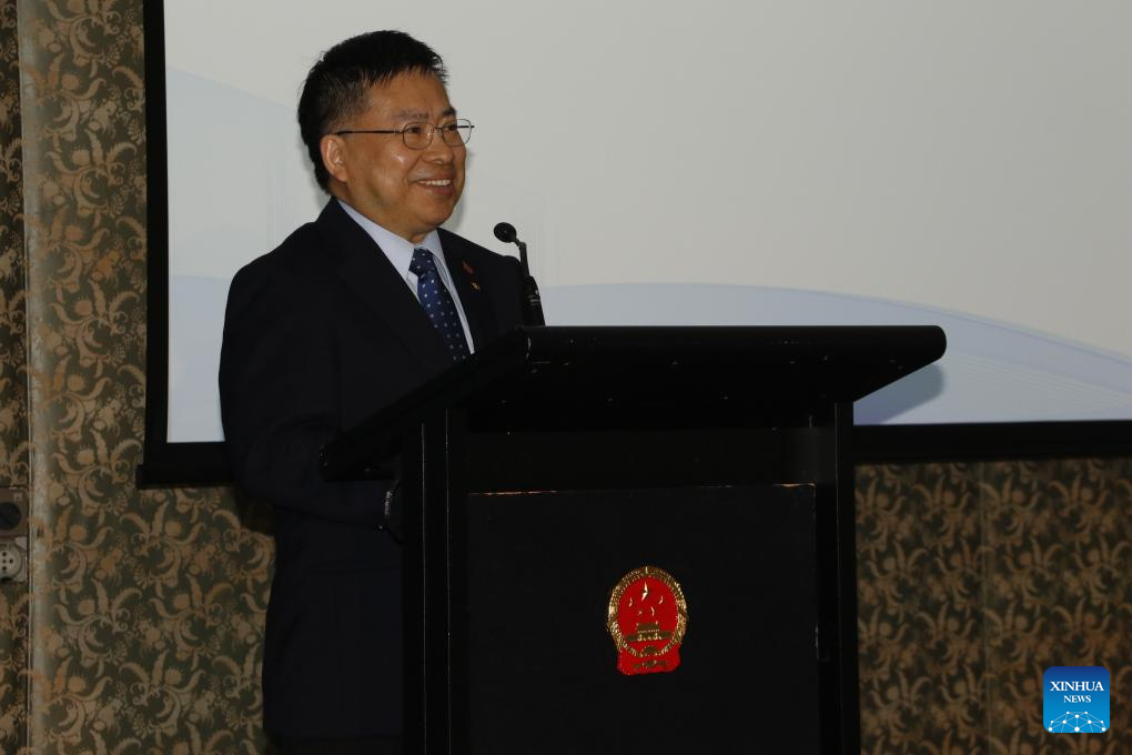 Chinese Consul General in Brisbane Ruan Zongze speaks at a seminar in Brisbane, capital of Australia's northeastern state of Queensland, May 16, 2024. A seminar commemorating the 60th anniversary of Australian sinologist Colin Mackerras' teaching in China was held Thursday in Brisbane, capital of Australia's northeastern state of Queensland.