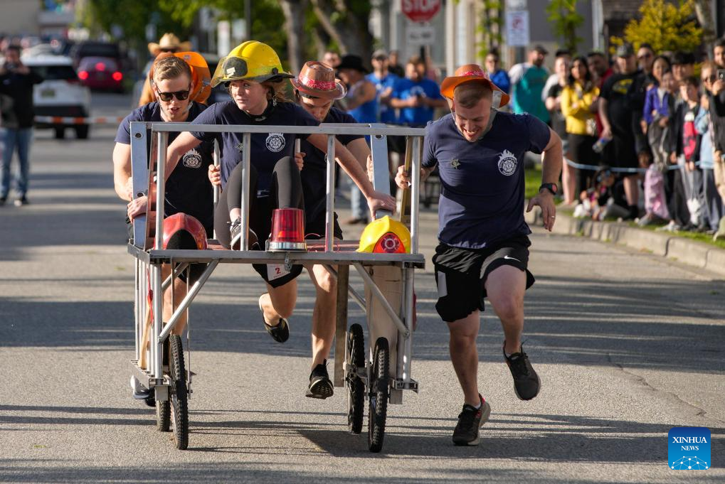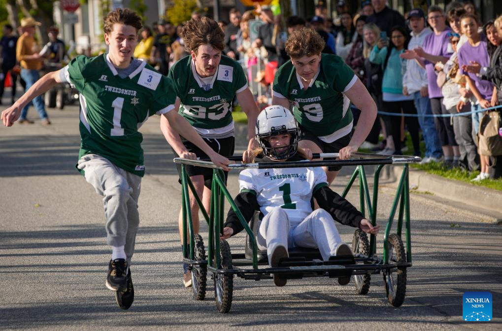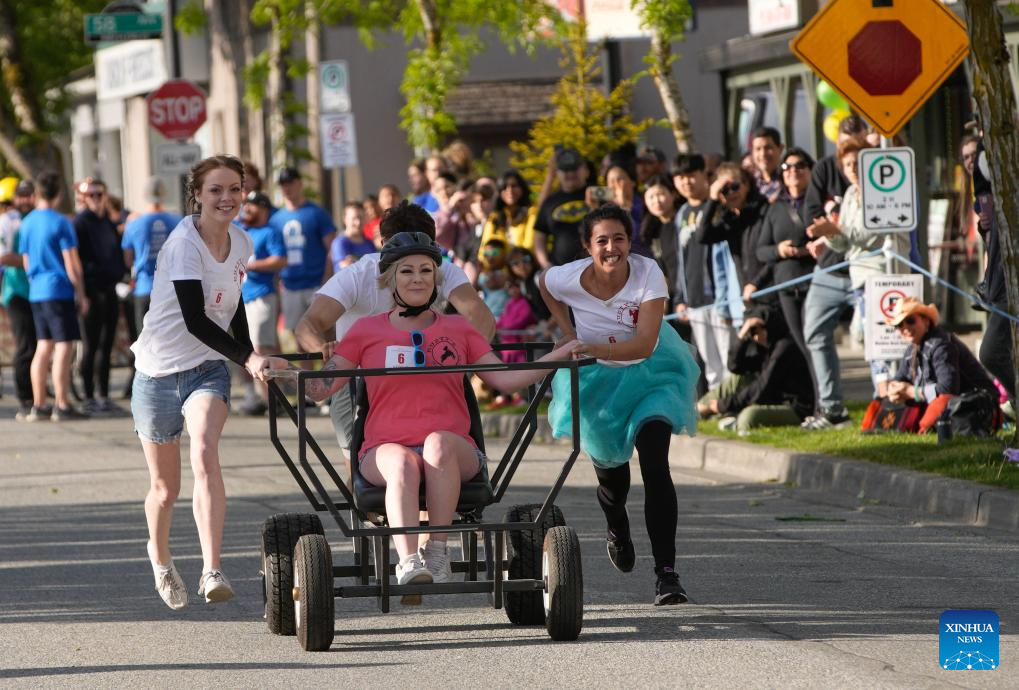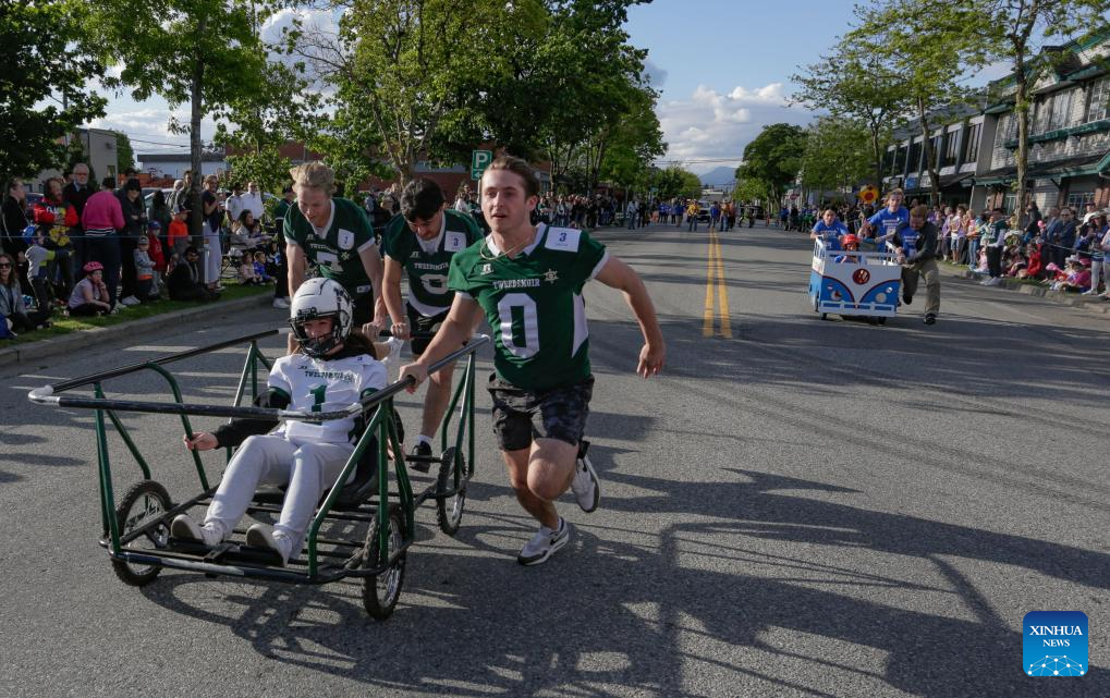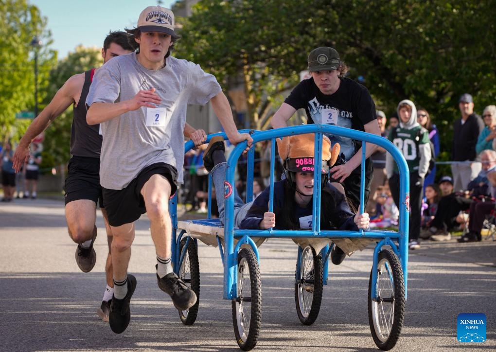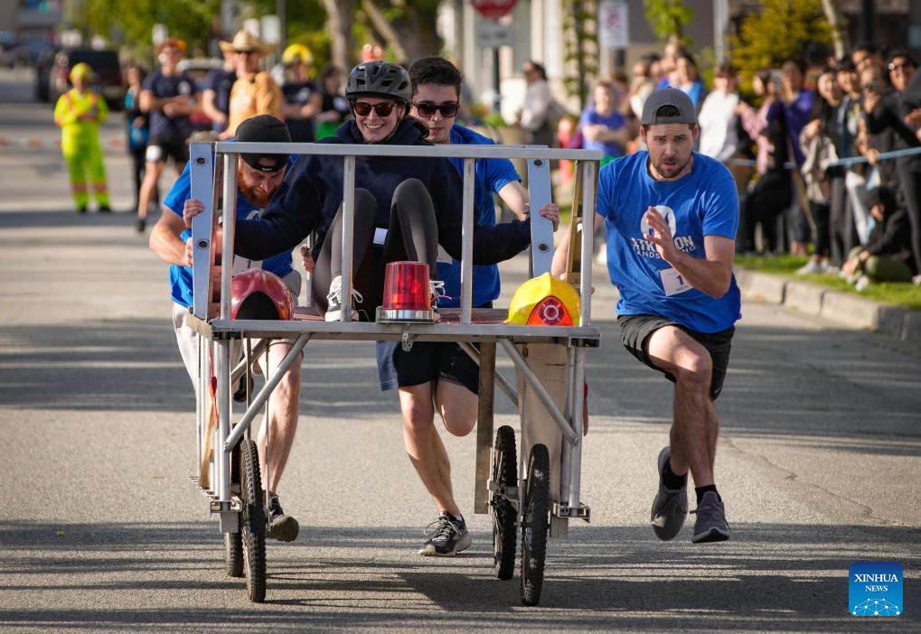 Participants compete during the annual Cloverdale Bed Race in Surrey, British Columbia, Canada, on May 16, 2024. Started in 1977, the traditional community event returned on Thursday, with participants teaming up to compete head-to-head on the street with their modified beds. (Photo by Liang Sen/Xinhua)