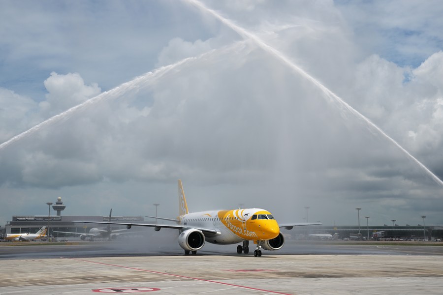 An Embraer E190-E2 passenger aircraft of Singaproe's budget airline Scoot receives water cannon greetings at Singapore's Changi Airport in Singapore on April 15, 2024. (Photo by Then Chih Wey/Xinhua)