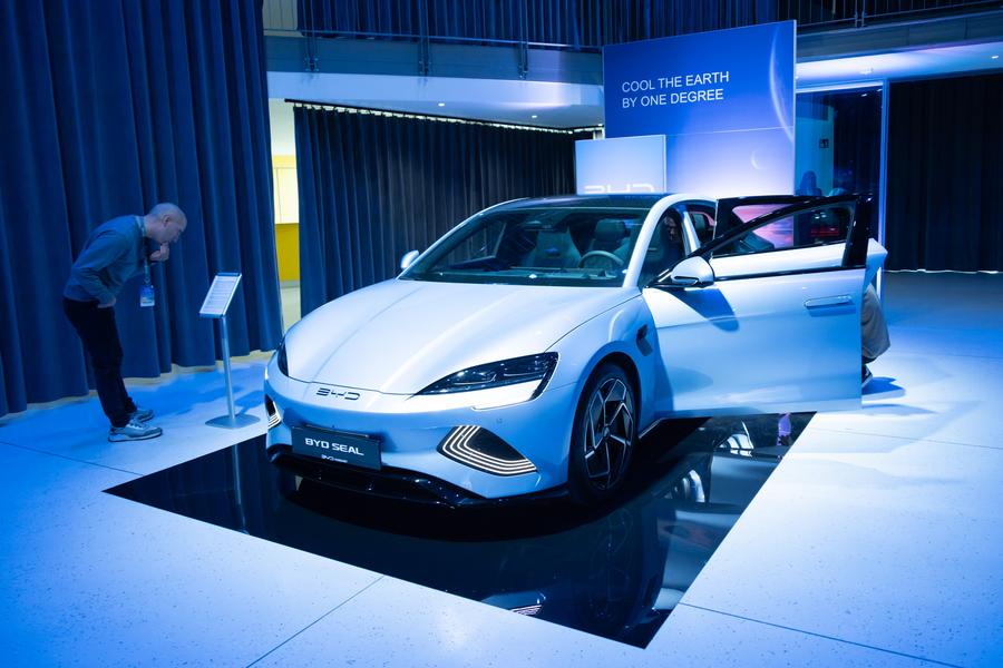 A man looks at a BYD electric vehicle in Budapest, Hungary, Oct. 17, 2023. (Photo by Attila Volgyi/Xinhua)
