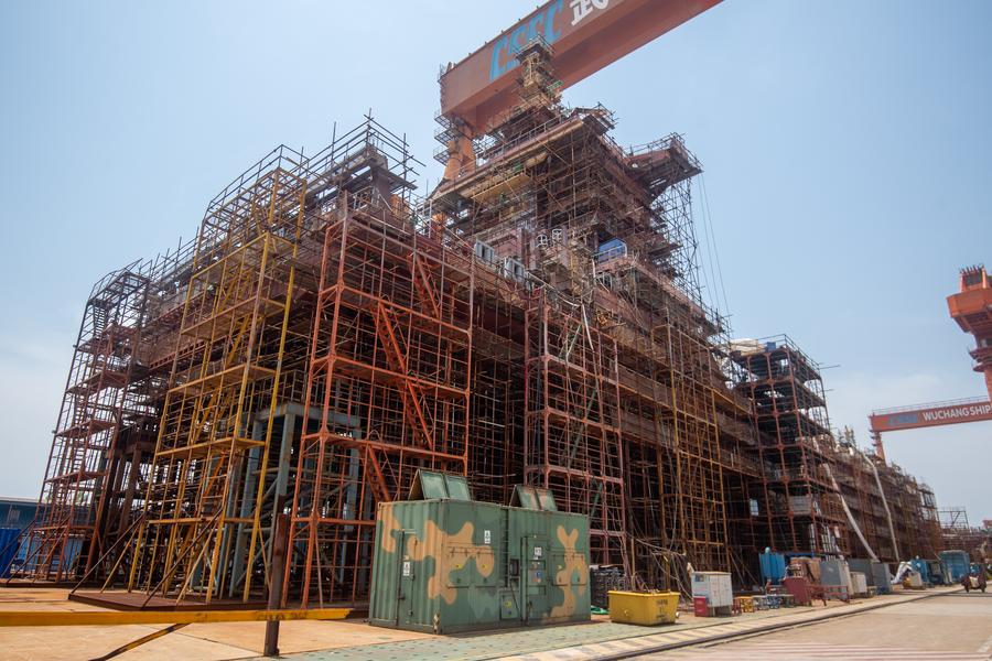 A new ship is under construction at a plant of Wuchang Shipbuilding Industry Group Co., Ltd. in Wuhan, central China's Hubei Province, May 16, 2024. (Xinhua/Du Zixuan)