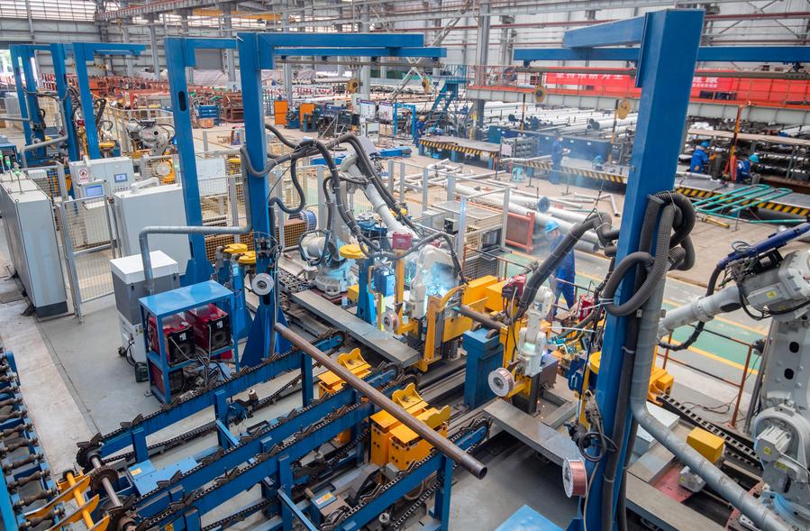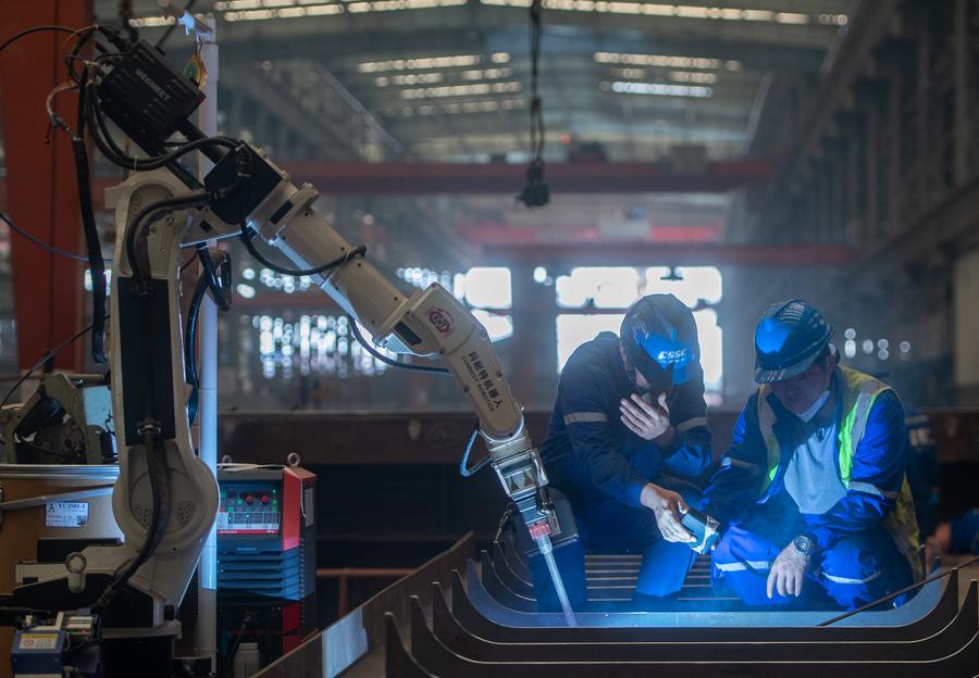 This photo taken on May 16, 2024 shows an interior view of a plant of Wuchang Shipbuilding Industry Group Co., Ltd. in Wuhan, central China's Hubei Province. (Xinhua/Du Zixuan)Staff members work at a plant of Wuchang Shipbuilding Industry Group Co., Ltd. in Wuhan, central China's Hubei Province, May 16, 2024. (Xinhua/Du Zixuan)A staff member measures the precision of parts at a plant of Wuchang Shipbuilding Industry Group Co., Ltd. in Wuhan, central China's Hubei Province, May 16, 2024. (Xinhua/Du Zixuan)Staff members check the work of a welding robot at a plant of Wuchang Shipbuilding Industry Group Co., Ltd. in Wuhan, central China's Hubei Province, May 16, 2024. (Xinhua/Du Zixuan)■