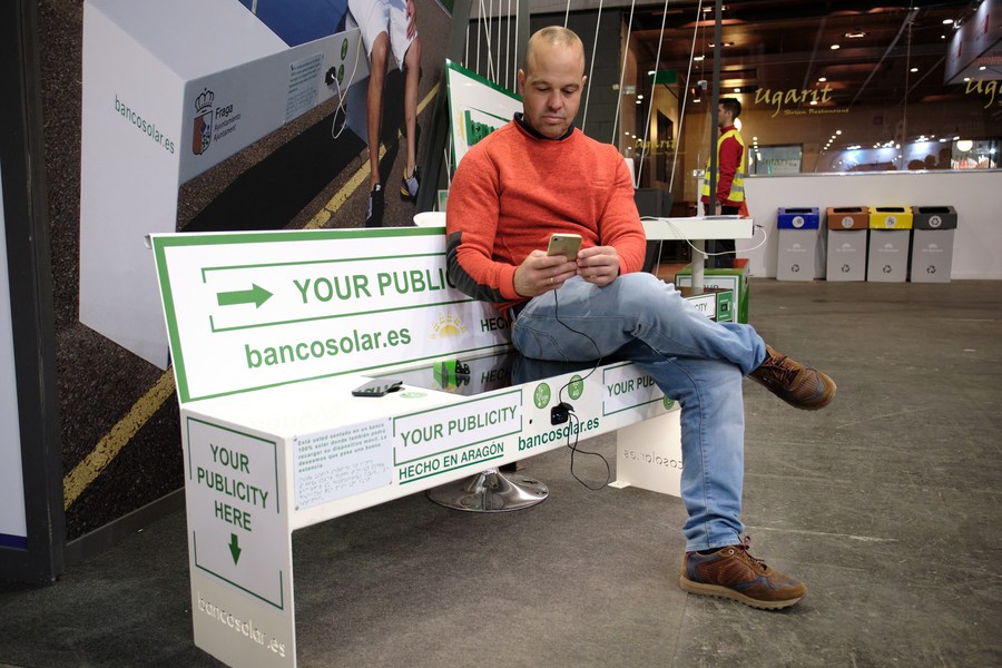 A man tries out a solar-power recharging bench on display at the 2023 Mobile World Congress (MWC) in Bacelona, Spain, Feb. 28, 2023. (Xinhua/Meng Dingbo)