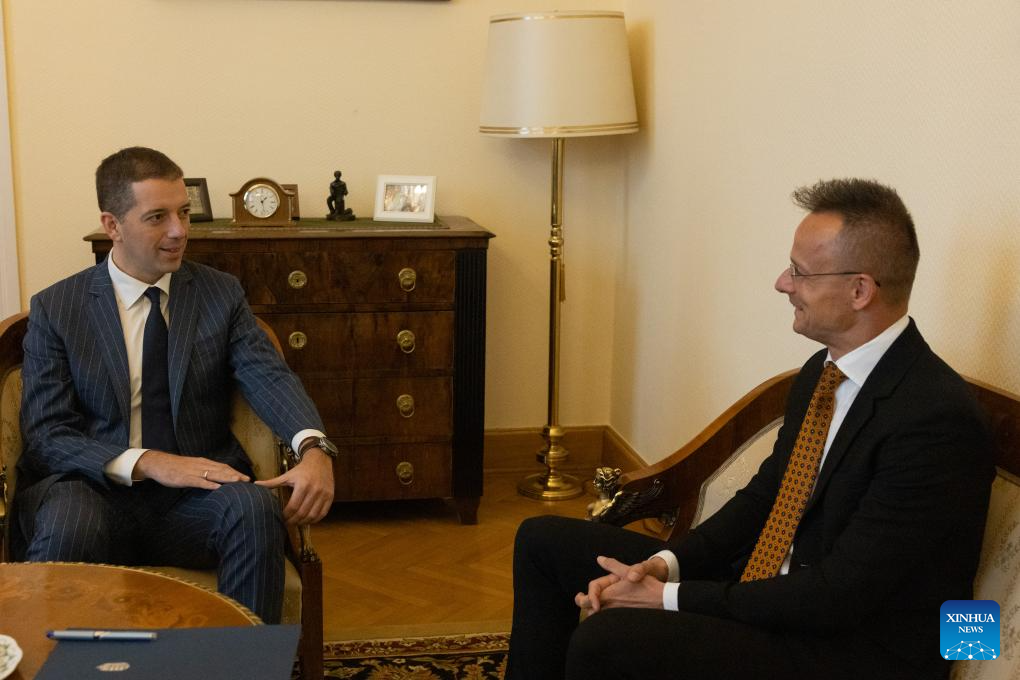 Hungary's Minister of Foreign Affairs and Trade Peter Szijjarto (R) meets with Serbian Foreign Minister Marko Djuric in Budapest, Hungary, on May 17, 2024. Hungary's Minister of Foreign Affairs and Trade Peter Szijjarto stressed on Friday the importance of his country's alliance with Serbia amid heightened regional tensions. (Photo by Attila Volgyi/Xinhua)