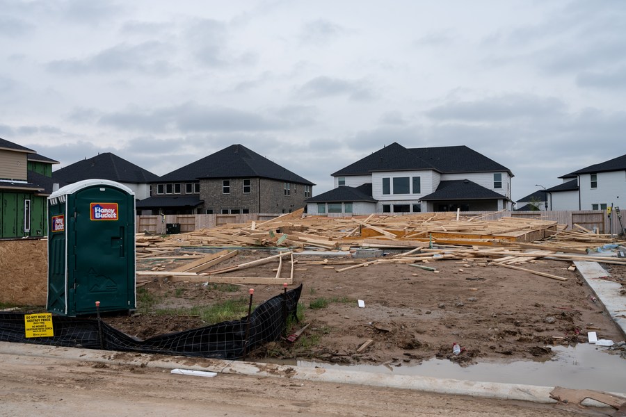 Photo taken on May 17, 2024, shows a housing unit under construction leveled by storms in northwestern Houston, Texas, the United States. (Photo by Chen Chen/Xinhua)