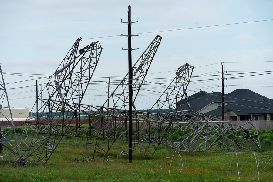Photo taken on May 17, 2024, shows electricity facilities damaged by storms in northwestern Houston, Texas, the United States. (Photo by Chen Chen/Xinhua)