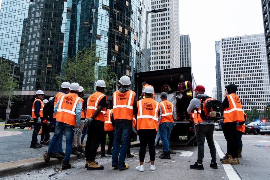 A restoration team prepares to clear debris in downtown Houston, Texas, the United States, on May 17, 2024. (Photo by Chen Chen/Xinhua)