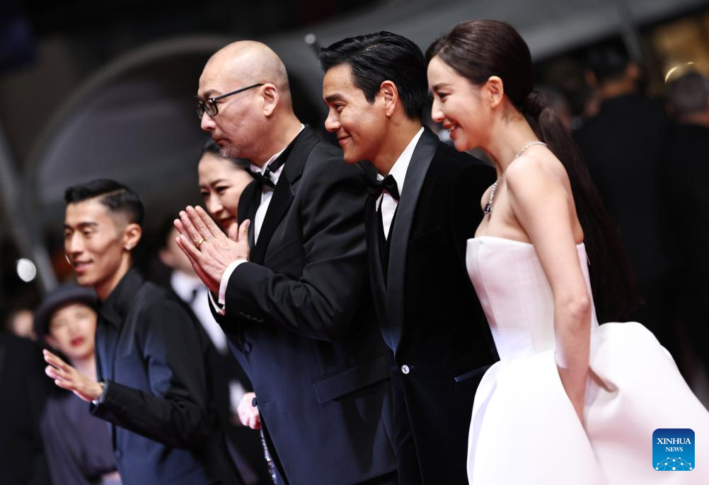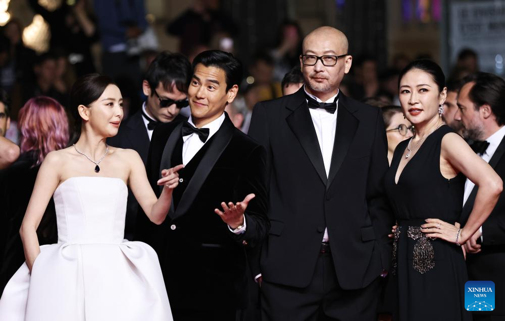 Chinese director Guan Hu (2nd R) and cast members Tong Liya (1st L), Eddie Peng (2nd L) and Liang Jing arrive at the red carpet for the film "Gou Zhen" (Black Dog) during the 77th edition of the Cannes Film Festival in Cannes, southern France, on May 17, 2024. The film "Gou Zhen" (Black Dog) is in competition for the category Un Certain Regard of the festival. (Xinhua/Gao Jing)