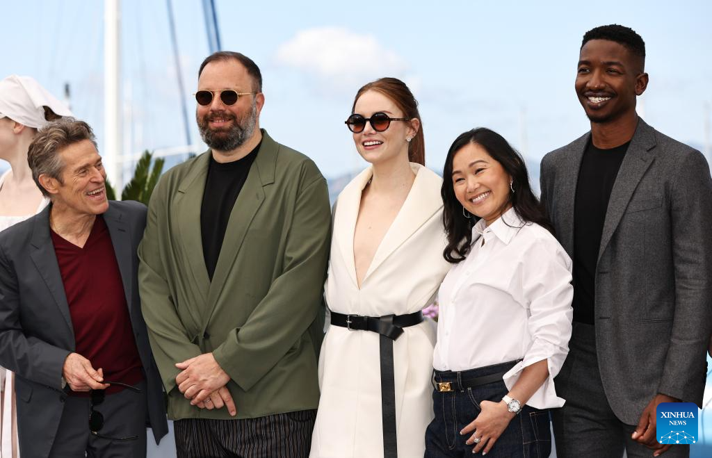 Greek director and screenwriter Yorgos Lanthimos (2nd L) poses with cast members during a photocall for the film "Kinds Of Kindness" at the 77th edition of the Cannes Film Festival in Cannes, southern France, on May 18, 2024. (Xinhua/Gao Jing)