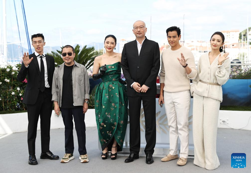 (From L to R) Actor Zhou You, actor Jia Zhangke, actress Liang Jing, director Guan Hu, actor Eddie Peng, actress Tong Liya pose during the photocall of the film "Black Dog" at the 77th edition of the Cannes Film Festival in Cannes, southern France, on May 18, 2024. (Xinhua/Gao Jing)