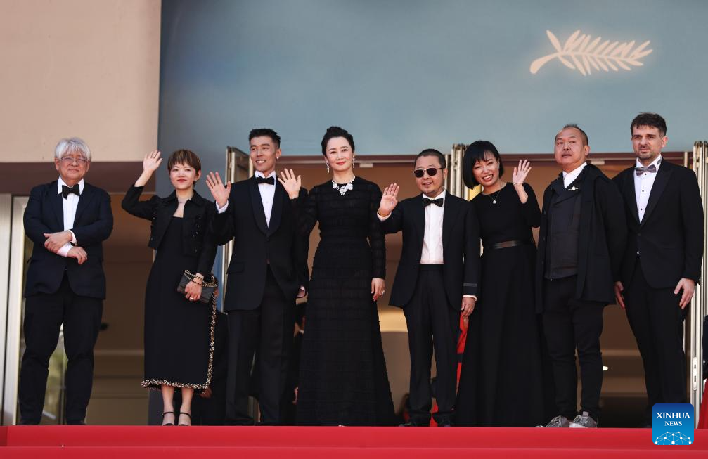 Chinese director Jia Zhangke (4th R) arrives with cast members at the red carpet before the premier of the film "Feng Liu Yi Dai (Caught by the Tides)" during the 77th edition of the Cannes Film Festival in Cannes, southern France, on May 18, 2024. (Xinhua/Gao Jing)