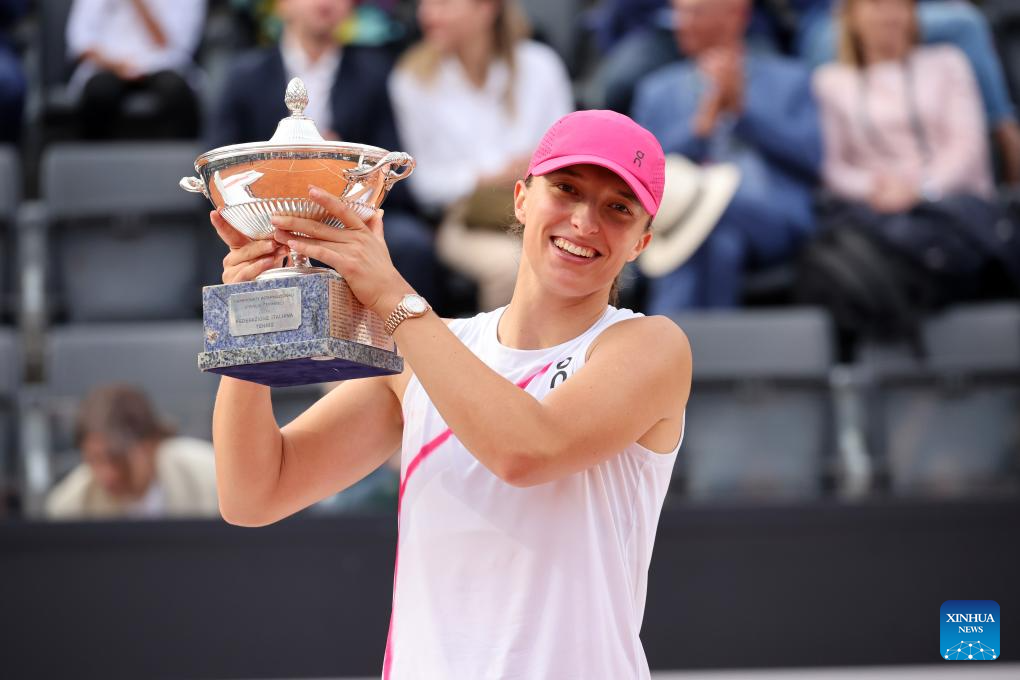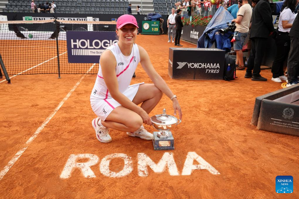 Iga Swiatek poses for a photo with her trophy after winning the women's singles final match between Iga Swiatek of Poland and Aryna Sabalenka of Belarus at the WTA Italian Open in Rome, Italy, May 18, 2024. (Photo by Alberto Lingria/Xinhua)