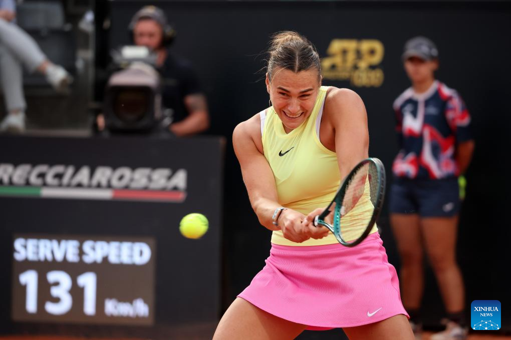 Aryna Sabalenka returns a shot during the women's singles final match between Iga Swiatek of Poland and Aryna Sabalenka of Belarus at the WTA Italian Open in Rome, Italy, May 18, 2024. (Photo by Alberto Lingria/Xinhua)