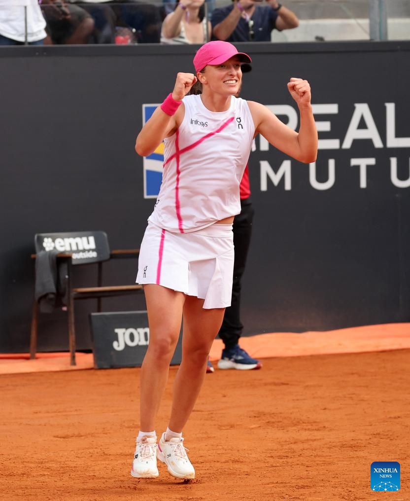 Iga Swiatek celebrates after winning the women's singles final match between Iga Swiatek of Poland and Aryna Sabalenka of Belarus at the WTA Italian Open in Rome, Italy, May 18, 2024. (Photo by Alberto Lingria/Xinhua)