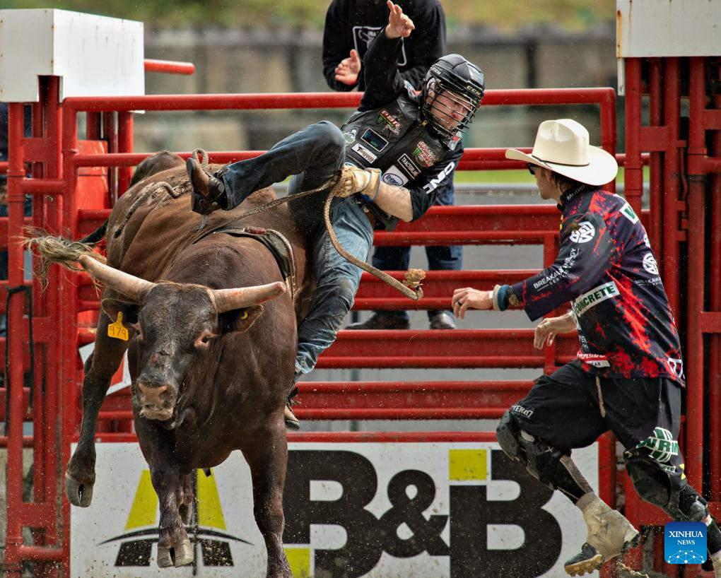 A participant performs in the bull riding at the rodeo performance of the 76th annual Cloverdale Rodeo and Country Fair in Surrey, British Columbia, Canada, May 18, 2024. (Photo by Andrew Soong/Xinhua)