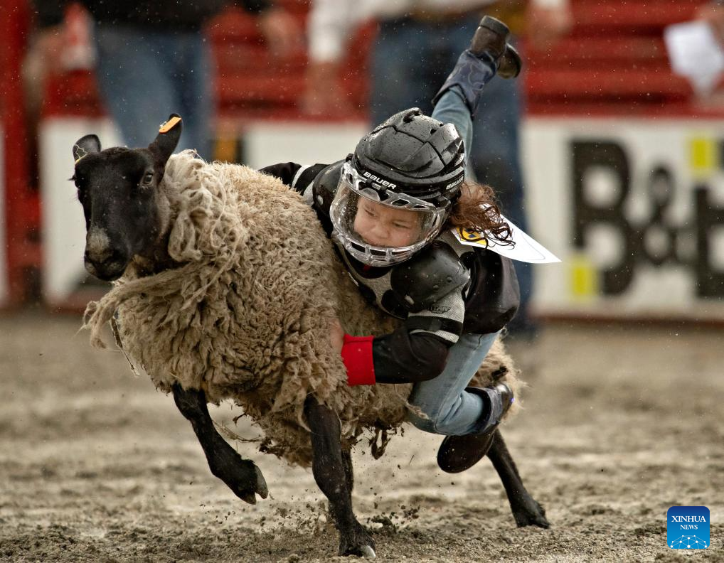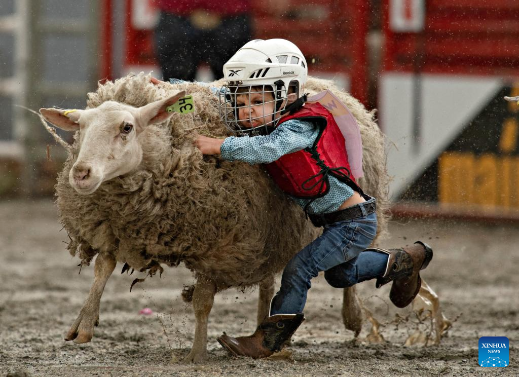 A child performs in the mutton bustin (sheep riding) at the rodeo performance of the 76th annual Cloverdale Rodeo and Country Fair in Surrey, British Columbia, Canada, May 18, 2024. (Photo by Andrew Soong/Xinhua)