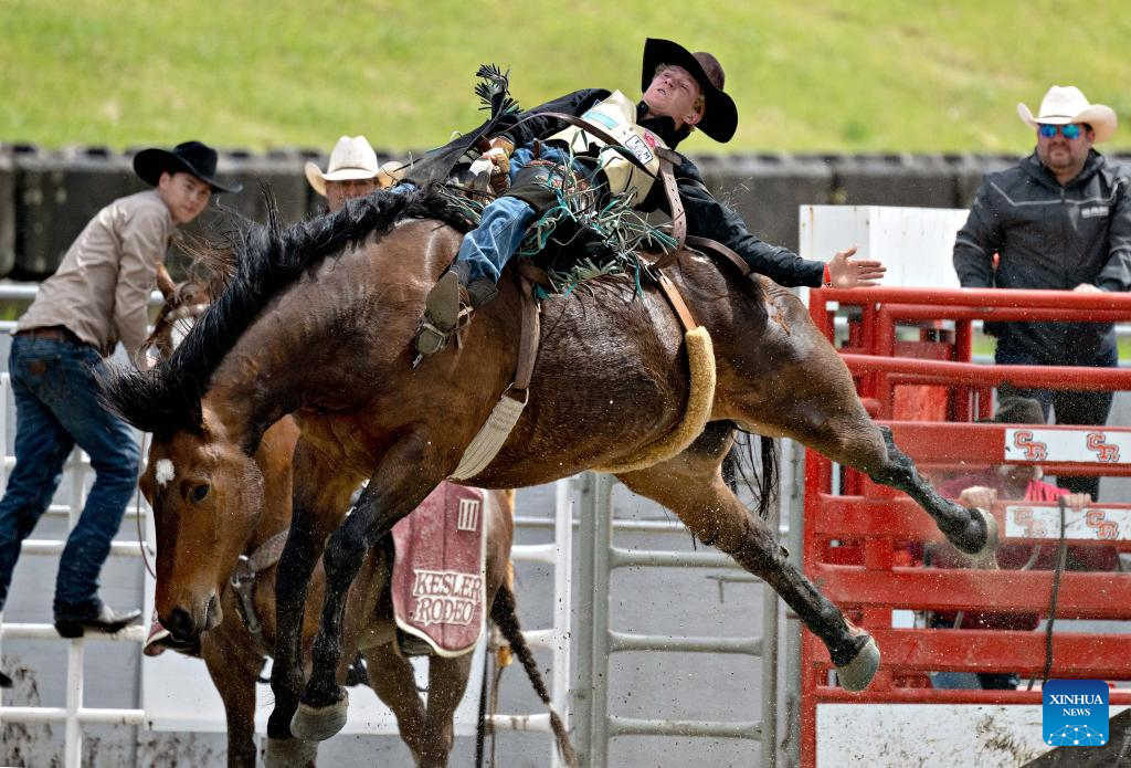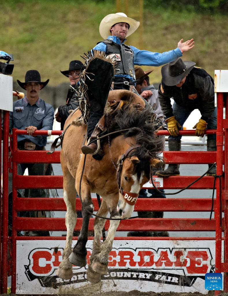 A participant performs in the saddle bronc riding at the rodeo performance of the 76th annual Cloverdale Rodeo and Country Fair in Surrey, British Columbia, Canada, May 18, 2024. (Photo by Andrew Soong/Xinhua)