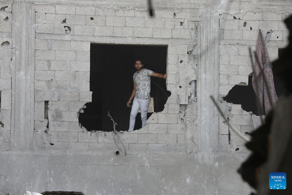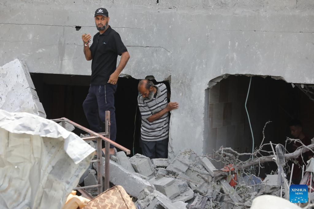 Local sources and eyewitnesses told Xinhua that Israeli warplanes targeted at dawn an inhabited house for the Hassan family in the Nuseirat Palestinian refugee camp, which led to its destruction. (Palestinian News Agency/Handout via Xinhua)