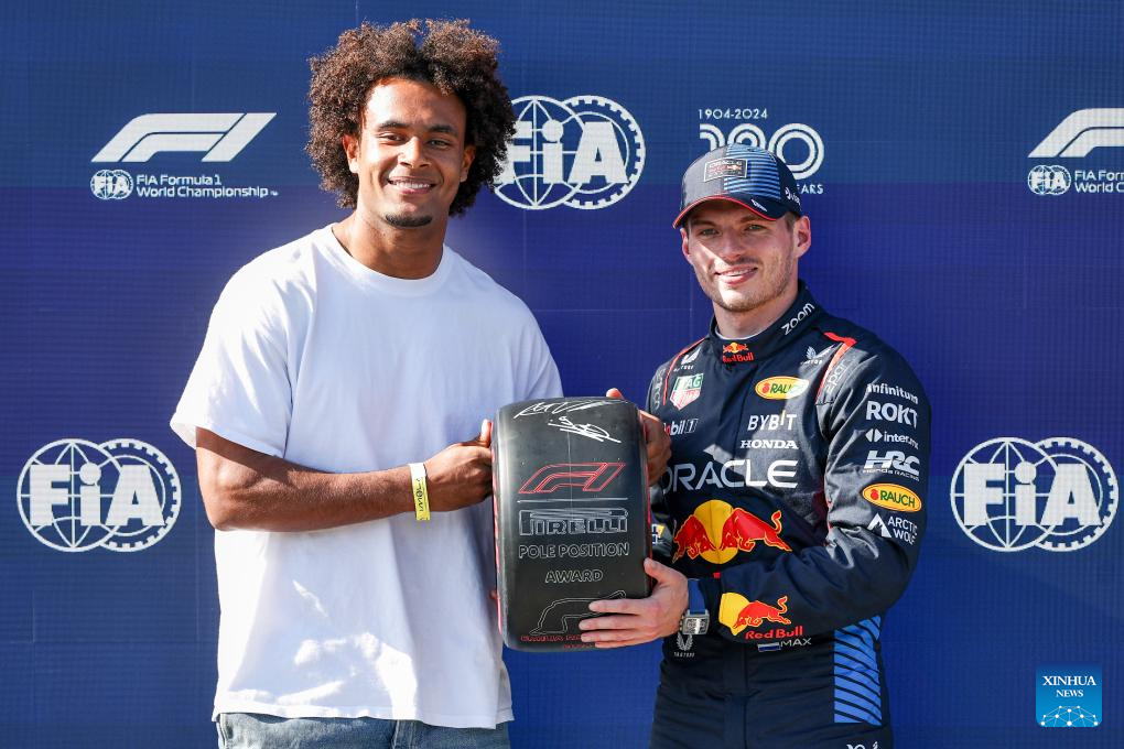 Red Bull Racing's Dutch driver Max Verstappen (R) poses for a photo with Serie A Bologna's football player Joshua Zirkzee after winning the pole position during the qualifying session of the Formula One Emilia Romagna Grand Prix held at the Autodromo Internazionale Enzo e Dino Ferrari race track in Imola, Italy, May 18, 2024. (Photo by Qian Jun/Xinhua)