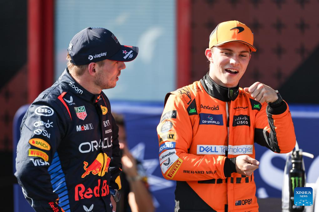 Red Bull Racing's Dutch driver Max Verstappen (L) talks to McLaren's Australian driver Oscar Piastri after the qualifying session of the Formula One Emilia Romagna Grand Prix held at the Autodromo Internazionale Enzo e Dino Ferrari race track in Imola, Italy, May 18, 2024. (Photo by Qian Jun/Xinhua)