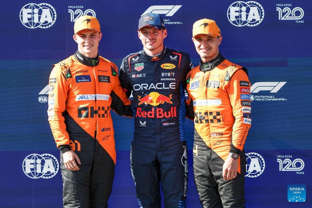 Red Bull Racing's Dutch driver Max Verstappen (C), McLaren's Australian driver Oscar Piastri and McLaren's British driver Lando Norris pose for a photo during the qualifying session of the Formula One Emilia Romagna Grand Prix held at the Autodromo Internazionale Enzo e Dino Ferrari race track in Imola, Italy, May 18, 2024. (Photo by Qian Jun/Xinhua)